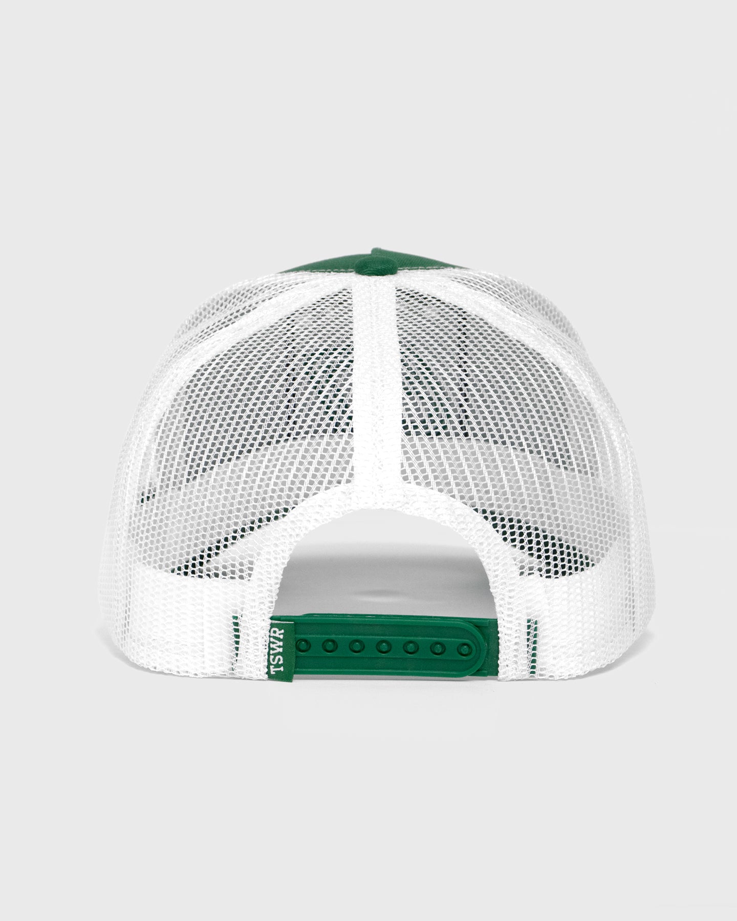 - Two-tone. (White mesh, vintage green cotton front panel and bill).